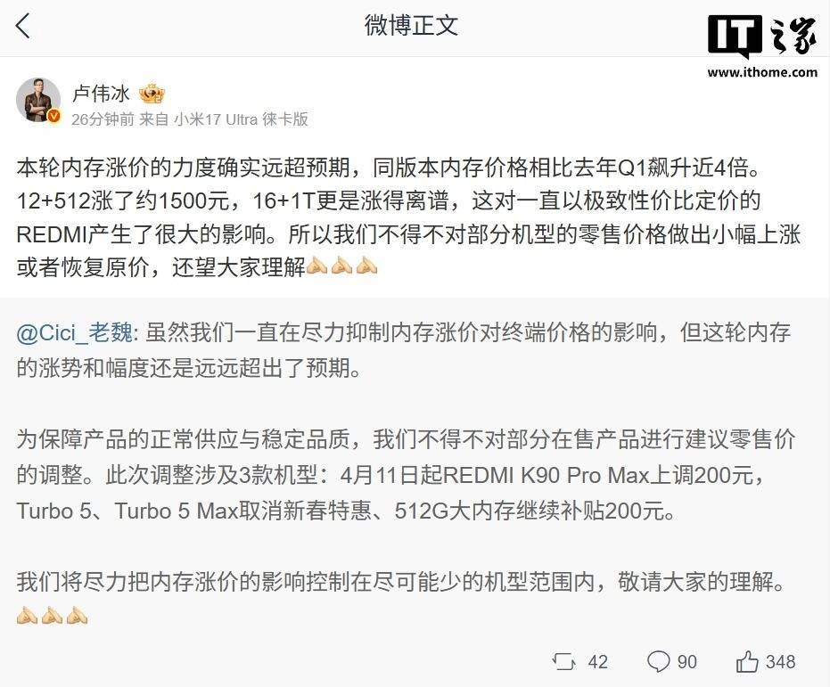 本轮内存涨价的力度确实远超预期,同版本内存价格相比去年 Q1 飙升近 4 倍。12+512 涨了约 1500 元,16+1T 更是涨得离谱,这对一直以极致性价比定价的 REDMI 产生了很大的影响。所以我们不得不对部分机型的零售价格做出小幅上涨或者恢复原价,还望大家理解